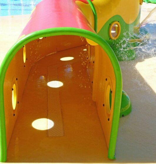 … Les enfants vont adorer se balader dans ce tunnel sur votre plateforme aqualudique ! Mais ce tunnel est très taquin, en effet, si les enfants y entreront secs, ils en ressortiront trempés !