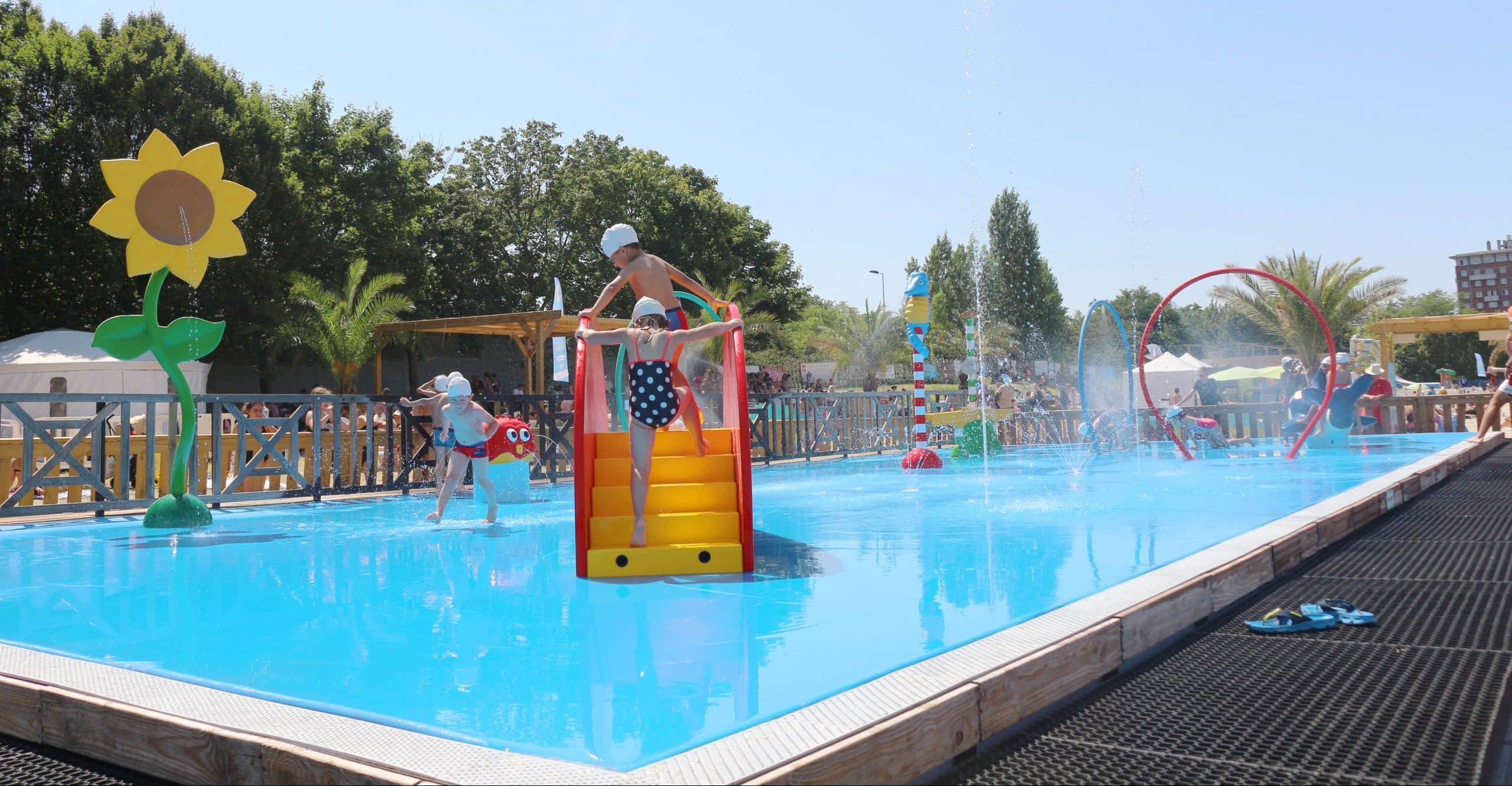 • Un bassin mobile de 100m² (10 x 10 m) et 80cm de profondeur, adapté aux plus petits. L’idée principale étant de permettre aux enfants de s’initier à la natation ou d’appréhender l’espace aquatique facilement